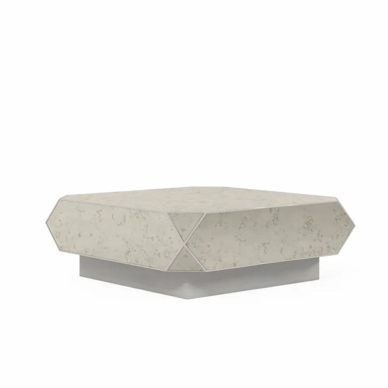 The classic romance of Paris enters the 21st century with this strikingly reflective cocktail table. Its square form is punctuated by faceted corners in triangular shapes, showcasing the beauty of antiqued mirror panes. Modern chic meets timeless warmth in this stunning table, sure to be the shining jewel of any living space.