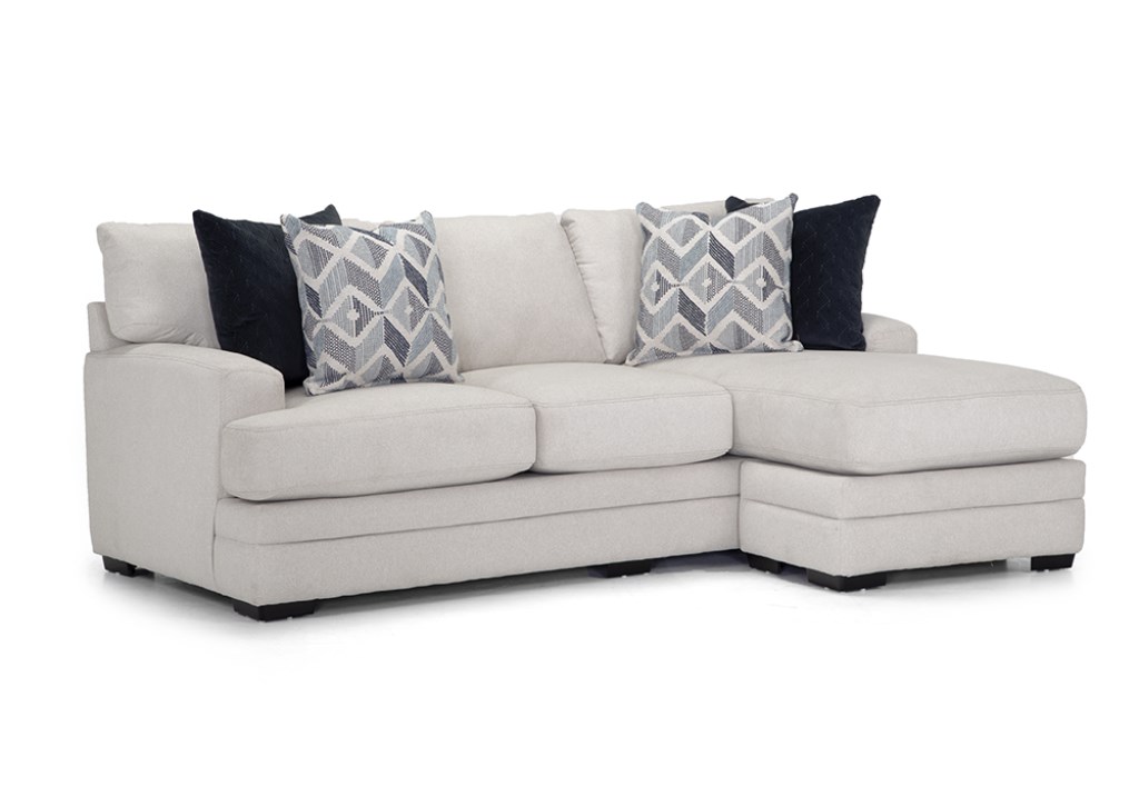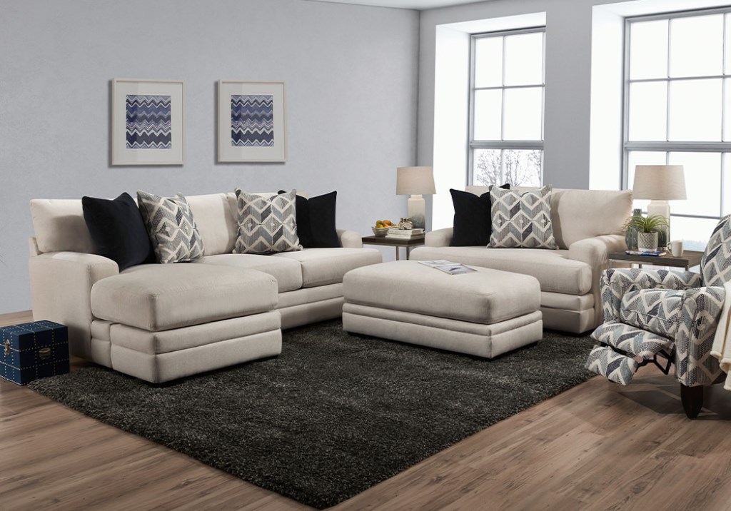 The Zackary Collection offers a sofa with reversible chaise, chair and a half and matching ottoman upholstered in Casey Shell, a cream colored fabric, and accented throw pillows with pops of light and dark gray and blue.